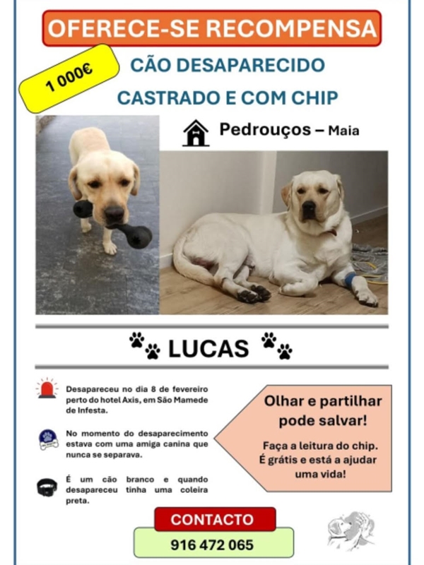 O Lucas desapareceu no dia 8 de fevereiro em São Mamede de Infesta. Quando desapareceu tinha uma coleira preta. Está castrado e tem microchip. Se tiver informações sobre a localização dele, contacte: 916 472 065.